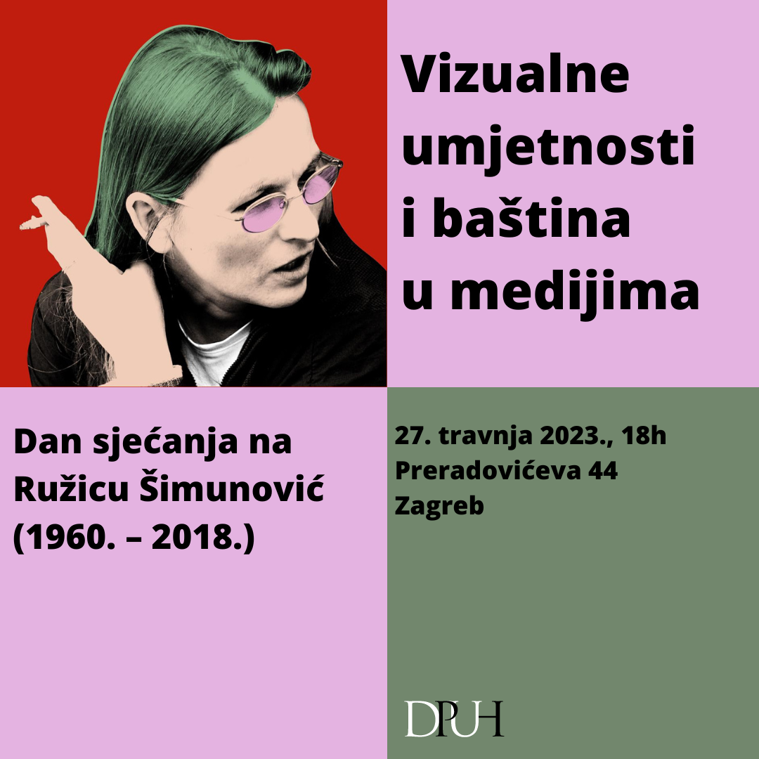 Jednogodišnji susreti nazvani Vizualne umjetnosti i baština u medijima: dan sjećanja na Ružicu Šimunović – u počast likovnoj kritičarki Ružici Šimunović (Rijeka, 23. studenoga 1960. – Washington D.C., 27. travnja 2018.), koja je u svojim radijskim emisijama ostvarila dijalog između povjesničara umjetnosti, likovnih kritičara, umjetnikā te medija – do sada su održani u različitim formatima: prvi je bio okrugli stol (2019.) s izlaganjima na temu naslova susreta, drugi je virtualno ugostio jednu od najpoznatijih britanskih umjetnica, Tacitu Dean, koja je 27. travanja 2020. omogućila pristup video-performansu Event for a Stage (2015.), treće godine priređena je e-publikacija o likovnoj kritici s tri ulomka iz Ružičinih tekstova te kratkim tekstovima mladih likovnih kritičara – Tihane Bertek, Maje Flajsig, Bojana Krištofića, Mione Muštra i Klare Petrović – ilustriranu duhovitim „kratkim rezovima“ likovnoga kritičara i kustosa Marka Goluba, a četvrte godine umjetnica i dramaturginja, Pavlica Bajsić Brazzoduro, ravnateljica Centra mladih „Ribnjak“ u Zagrebu premijerno je prikazala radio-dokumentarac posvećen Ružici Šimunović, nakon čega je – uz sudjelovanje nazočnih likovnih kritičara, urednika na radiju i u novim medijima – razgovor uživo posvećen temi intermedijalnosti i pitanjima kako je radio kao medij prošao kroz „slikovni obrat“, tako značajan za suvremeno iskustvo života a onda, dakako, umjetnosti i likovne kritike (27. travnja 2022.).