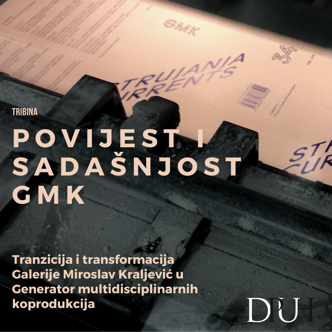 Galerija Miroslav Kraljević (GMK) osnovana je u okviru Kulturno-umjetničkog društva INA (KUD INA), kao jedna od njegovih sekcija i izvorno je bila namijenjena izlaganju radova članova društva (radnika / umjetničkih amatera) i studijskih izložbi istaknutih umjetnika visokog modernizma. Relativno mala galerija u Šubićevoj ulici 29 u Zagrebu ubrzo se profilirala i postala relevantno mjesto za promociju suvremene vizualne umjetnosti i izlaganja suvremenih umjetničkih praksi u Zagrebu i u širim okvirima. Godine 2017. tvrtka INA je zgradu napustila i dala u najam, čime je daljnji rad GMK došao u pitanje i njezina budućnost postala krajnje neizvjesna. Kako bi nastavila s profiliranom izlagačkom djelatnošću i programima te sačuvala već uhodan galerijski prostor u dijelu grada u kojem nema sličnih sadržaja, kustoski tim osniva udrugu pod nazivom Generator multidisciplinarnih koprodukcija (GMK) te objavljuje publikaciju u kojoj je zabilježena povijest Galerije. Namjera je bila afirmirati kustoske pozicije i rad svih voditelja te ukazati na širi krug umjetnika, kustosa, institucija i ostalih kulturnih radnika koji su participirali u programu i tako sudjelovali u izgradnji pozicije GMK-a na kulturnoj sceni. O značenju Galerije Miroslava Kraljevića za hrvatsku likovnu scenu, načinu nekadašnjega rada pod pokroviteljstvom moćne kompanije INA i današnjoj situaciji, govorit će nekadašnji dugogodišnji voditelj Branko Franceschi, nekadašnje kustosice i urednice publikacije Sanja Sekelj, Ana Kovačić, Lea Vene te likovni kritičar Marko Golub i povjesničarka umjetnosti Irena Kraševac.