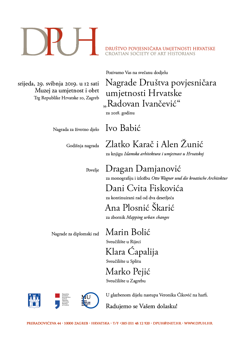 Zlatko Karač i Alen žunić dobitnici su Godišnje nagrade Društva povjesničara umjetnosti Hrvatske „Radovan Ivančević“ za knjigu „Islamska arhitektura i umjetnost u Hrvatskoj“ objavljenu u 2018. godini (izdavači: Arhitektonski fakultet Sveučilišta u Zagrebu i UPI-2M PLUS)