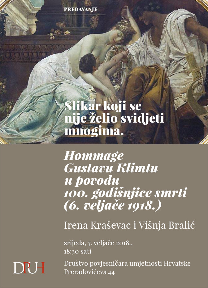 Na predavanju ćemo podsjetili na važnost i iznimnost umjetnika čiji je slikarski put od salonskog slikara do rodonačelnika bečke secesije bio vrlo turbulentan kao i kasnija valorizacija njegova djela. Susret s Klimtovim originalima ne ostavlja nas ravnodušnim i njegova umjetnost i život okupiraju pažnju stručnjaka cijelo stoljeće. Klimtove slike praznik su za oči: zavode nas svojim bogatstvom motiva i visokom estetizacijom, a iza sjajnih, izazovnih površina, naziru se neizrečene emocije, potisnute traume i zatomljeni osjećaji modernog čovjeka na prijelomu 19. u 20. stoljeće.