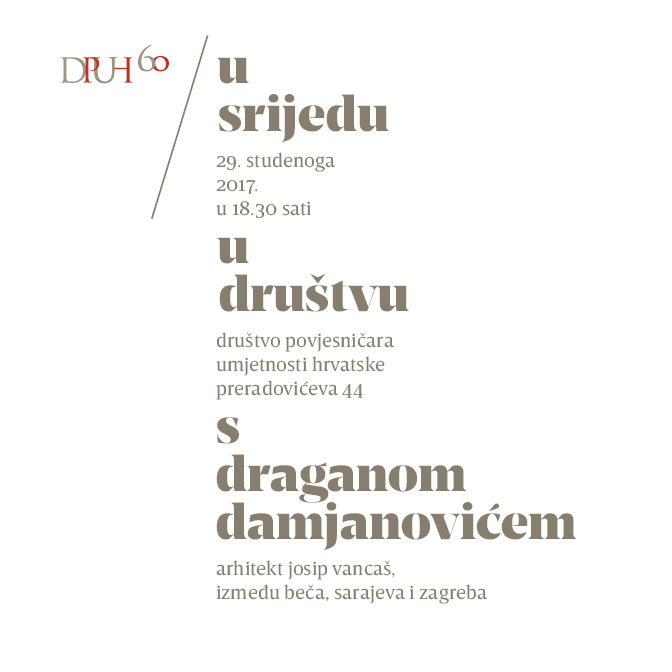 Josip pl. Vancaš (Šopron, 1859. – Zagreb, 1932.), ubraja se u nesumnjivo najvažnije arhitekte Hrvatske, Bosne i Hercegovine te cijeloga juga Austro-Ugarske Monarhije kraja 19. i početka 20. stoljeća. Radi se istodobno o jednom od najplodnijih arhitekata toga vremena koji je realizirao više od dvije stotine građevina (70 crkava, 10 javnih građevina, 12 škola, 6 hotela i kavana, 110 palača i najamnih zgrada te 10 banaka). Na ovome predavanju, organiziranome u povodu 85. obljetnice Vancaševe smrti, donijet će se pregled njegova stvaralaštva koje će se nastojati kontekstualizirati s događanjima u arhitekturi Srednje Europe na prijelazu iz 19. u 20. stoljeće.